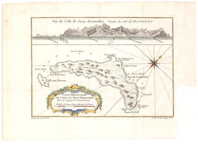 Small map of the Chilean Juan Fernandez Island, topped by a view of its rocky profile and adorned with a decorative title cartouche and a compass rose with fleur-de-lys. The map was based on Admiral George Anson's voyage in 1740, when he set sail in command of a squadron sent to attack Spanish possessions and interests in South America. The expedition was ill-equipped and failed to carry out its original ambitious mission. By June 1741 when Anson reached Juan Fernandes, his force had been reduced to only three of the original six ships, while the strength of his crews had fallen from 961 to 335. After launching several attacks on the west coast of South America and recuperating on the island, he collected the remaining survivors on his flagship, the Centurion, and set sail in search of one of the richly laden galleons that conducted the trade between Mexico and the Philippines. The indomitable perseverance he had shown during one of the most arduous voyages the history of sea adventure gained the reward of the capture of an immensely rich prize, the Nuestra Senora de Covadonga, which he encountered off Cape Espiritu Santo on June 20, 1743.