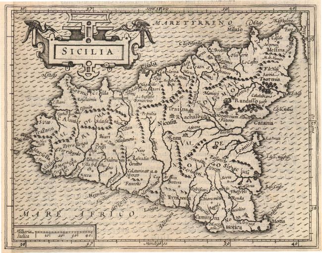 Delightful small map of Sicily filled with topographical detail and place names. A smoking Mt. Etna is depicted at right. Embellished with title and scale cartouches. On full sheet of English text (8.0 x 11.8") and text on verso.