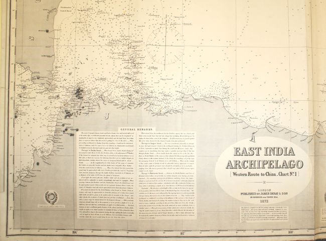 An impressive blue-backed chart on two joined sheets showing the Java Sea and the adjacent islands of Sumatra, Java, Bangka, Belitung (Billiton) and Borneo. This detailed chart includes hundreds of soundings, reefs, anchorages, rocks, and shoals. There are extensive navigational notes regarding currents and passage through Banka Strait, Gaspar Strait, and Karimata Strait. There is also good information along the coasts of towns, forts, capes, points, rivers, and mountain peaks. Lighthouses are marked with red and yellow, as is typical on Imray charts. This is one of the largest and most comprehensive charts of the Java Sea designed for navigation in the late 19th century. The chart was one of six charts showing the western route to China published by James Imray & Sons, in London. On verso is a paper label stating: "Western Route to China. Chart No. 1" with a marked price of 7s.