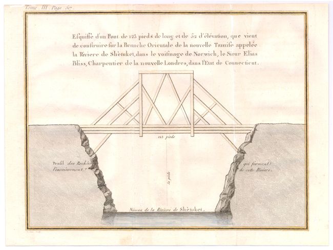 Interesting plate from a French edition of Crevecoeur's important early collection of essays (Letters from an American Farmer), which shows a bridge over the Shetuket River near Norwich, Connecticut. Engraved by Pierre Francois Tardieu. At upper left above neatline is "Tome.III .Page 517.