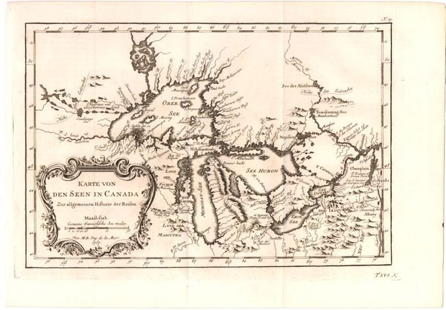 This is an excellent French & Indian War period map depicting the five Great Lakes. While this map uses the same title as Bellin's prototype map of the Great Lakes, published in Charlevoix’s Histoire et Description Generale de la Nouvelle France in 1744, it has been updated with information from Bellin's similar map of 1755. Lakes Erie and Ontario are more accurately defined and the spurious islands in Lake Huron have been eliminated. However, several large, bogus islands still remain in Lake Superior, including I. Minong (called I. Philippeaux on some issues) and I. Pontchartrain. The Michigan peninsula is still misshapen with a massive mountain range down its center. Numerous forts are located: S. Jgnace, Niagara, des Miamis, and Toronto to mention a few. The ornate rococo title cartouche is draped with ivy.