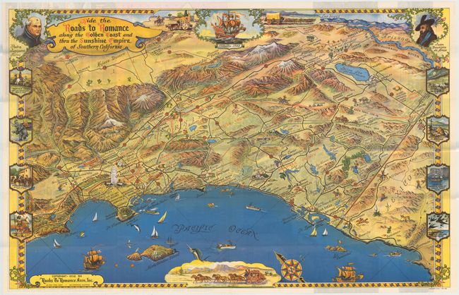 This very colorful bird's-eye view of Southern California is drawn in the style of Jo Mora. The map covers the counties of San Bernardino, Los Angeles, Orange, Riverside, San Diego, and Imperial. It shows missions, places of interest and historically significant events in the region. Features an attractive border with various vignettes. On the verso is a map covering the area from Los Angeles to San Diego with 78 points of interest identified and described. The map was drawn by Claude G. Putnam and folds into a 4 x 9" brochure.