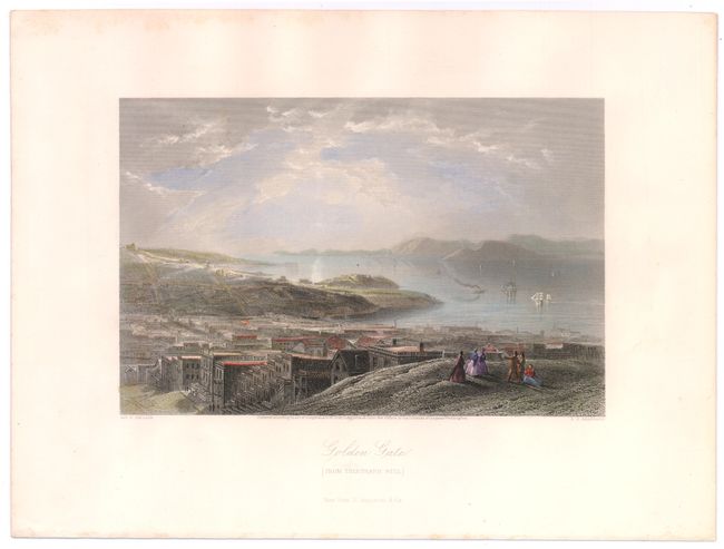 Lovely panoramic view from a hill overlooking the city and bay with a beautiful sunset sky. Early street layout evident on facing hill with very few buildings constructed. In the bay are several sailing ships and one steamer making its way into the bay. Precisely engraved on steel by E. P. Branderd and published by D. Appleton & Co.