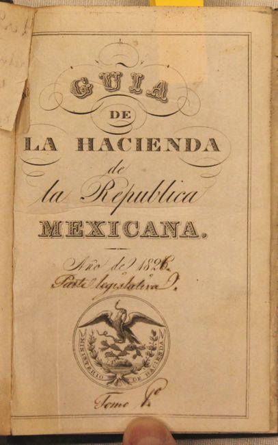 This fascinating book, by Jose Ignacio Esteva on behalf of the Mexican Ministry of Finance (Ministerio de Hacienda), explains all of the laws and regulations instated by the First Mexican Empire as of August 1823. The book features an untitled map (14.2 x 9.8") at the front, engraved by John Drayton, which clearly shows all of the US-Mexico border. The map extends north to 40 degrees latitude and east to the Florida panhandle and shows Mexico in control of the area around Texas extending to the Arkansas River. Twenty-one Mexican states and territories are identified with a numbered key at left, including the territories of California, New Mexico and Texas. Several unexplored areas around Arizona, southern California and central Texas are marked as Yndios Gentiles (Gentile Indians). There is very good detail of the river systems in the region, and numerous towns are named, including New Orleans, Cincinnati, Santa Fe, San Francisco, and San Diego. 309 pages plus 11 index pages. 24mo, quarter green leather with green embossed cloth-covered boards, and gilt titling on spine.