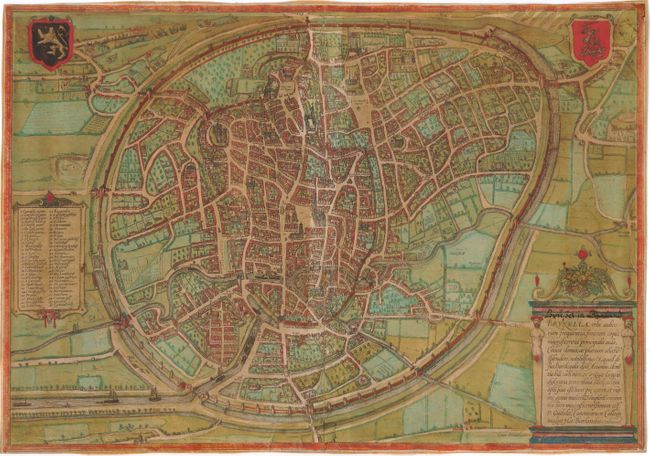 This great plan of the city shows every individual building, the circling moat with numerous bridges, and more. The entire city is surrounded by the fortified wall with many turrets and towers. Strong fortifications were employed to protect Brussels, still the city relied heavily on trade as evidenced by the waterways passing through the walls to permit commerce. Numerous ships are shown entering the city and moored within it. At left is a list of more than fifty important buildings that is keyed to the plan. At lower right the architectural themed cartouche encloses the Latin title. The coat-of-arms for Belgium and the city are displayed at the upper corners. Latin text on verso with page number 14 below the right page.