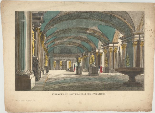These three attractive views depict the Hotel des Monnaies as seen from the nearby Pont Neuf bridge, the Sorbonne as viewed from the courtyard, and the Hall of Caryatides on the lower floor of the Louvre, which now houses Roman reproductions of Greek sculptures. Size varies slightly.