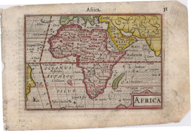 This map of Africa is interesting for its strange depiction of the Nile, which originates in a large lake south of the Equator. From this lake three large rivers flow to the seas: the Nile to the Mediterranean, the Congo to the Atlantic and what could be the Zambeze to the Indian Ocean. This map is based on the Gastaldi-Ortelius and Mercator models, although it includes the unique feature of a lake along the Equator into which both the two Ptolemaic lakes flow. The sea is engraved in a moiré pattern, and the map is further decorated with a strapwork title cartouche and three sea monsters, including a sea "lion." Though not signed, this map was likely engraved by either Jodocus Hondius or Petrus Kaerius, who engraved the majority of the maps of the Caert-thresoor (Map Treasury). This is the scarce first state without degrees of latitude in the borders, published by Cornelius Claesz and printed by Langenes. Dutch text on verso.