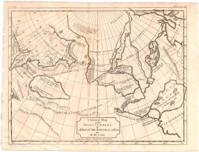 This fascinating map details the discoveries of Tchirikow, Bering, Bernarda, Spanberg and others. The major focus of the map is on Admiral Bartholomew de Fonte's purported exploration of the Pacific Northwest. In 1708, a newly discovered account of the Spanish Admiral's 1640 expedition was published. It was actually a hoax, but thereafter the account was elaborated upon by numerous mapmakers. The extravagant claims included the discovery of the Northwest Passage and a huge Sea of the West, both shown on this map.