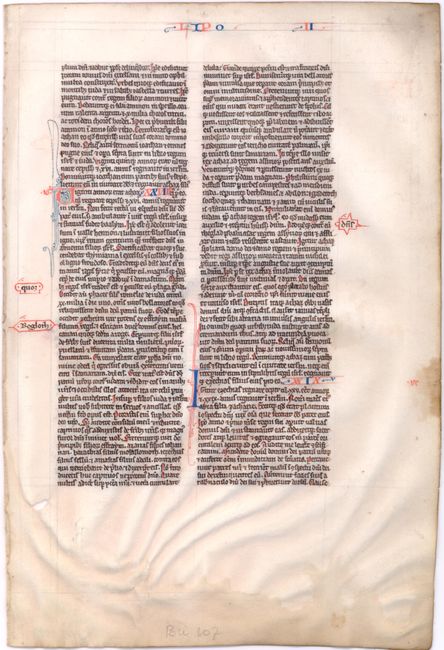 This is a very old vellum leaf from a French Bible. In Paris the birth of the Bible as we know it took place around 1200 and for the first time it was bound in a single volume; the order and names of the books were standardized and the text was divided up into numbered chapters. The scribes employed headings at the top of the page and used blue and red initials to mark the beginning of each chapter. The text on this leaf is written in two columns with decorative initials with pen work in red and blue. The text is from the book Paralipomenon II, more commonly knows as Chronicles, chapters 28-30. The scribe for this sheet must have been quite tired, as there are several mistakes which the scribe later corrected in the margins.