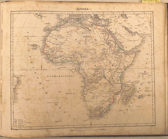 This complete example contains 82 maps and charts with the typical German proficiency and craftsmanship. Nearly every map is hand colored in outline, with the 2 celestial charts and a few regional maps left uncolored. The majority of the maps are focused on the European countries, but there are also maps of the continents of Asia, Africa, Australia, South America and three maps related to North America including: Nord America, Vereinigte Staaten Von Nord-Am, and Mexico, Mittel-America, and Texas. The map of the United States shows the relatively new state of Texas with the western boundary well into present day New Mexico and a large Upper California, Oregon Territory and Missouri Territory. Oblong folio, quarter leather with tips over marbled boards.