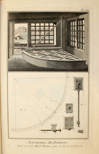 A fascinating set of plates relating to cartography, astronomy, mathematics, physics and more from Diderot's enormously influential work, drawn by Benard. The plates include illustrations of instruments used in hydraulics, astronomy, navigation, cartography, physics, pneumatics, and mathematics. The section on astronomy depicts planetary projections, telescopes, astrolabes, and even a plan for an observatory. The mathematics section includes a depiction of Pascal's calculating machine. This book includes 96 (of 102) plates numbered sequentially, with plates 52-57 missing. A detailed explanation of the plates and figures appears at the front of the book, with pages 7-8 missing, which correspond with plates 42-58. Folio, 13 pp. text and 96 plates. Professionally conserved and rebound in marbled-paper covered boards.