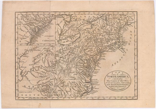 A finely engraved map based on the larger map by Didier Robert de Vaugondy (McCorkle 755.37). The map is filled with detail of early settlements, Indian villages, and topography. The colonies extend to the Illinois and Mississippi Rivers, with North Carolina shown in an unusual, skinny configuration. The top left of the map is filed with the inset "Supplement to Carolina" which extends the map through South Carolina and part of Georgia on the same scale. With an oval title cartouche at lower right in the Atlantic. This is a later edition of the map with Cary's name and imprint removed. Earlier, it appeared in Seally's 1782 Dictionary, in Michael Adam's New Royal Geographical Magazine, and in his 1794 New Royal System of Universal Geography.