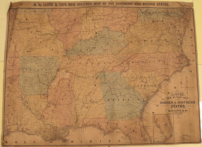 This large format Civil War map of the southern United States covers the area from Pennsylvania to Florida and from Virginia to the Kansas Territory. Railroads, roads, canals and numerous towns and villages are depicted in good detail. Battle areas are highlighted in red dots and lines. Backed in heavy linen. The verso of the map shows the signature of "Dahlgren 1st Div."