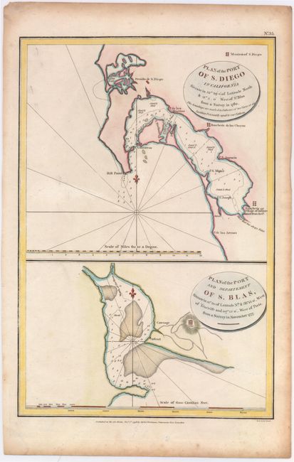 A pair of scarce and important early charts of San Diego and San Blas that are printed on one sheet with common border. The maps were based on the surveys of Juan Pantoja. Sailing out of San Blas, Pantoja, a captain of the Manila trade for Spain, visited much of today's California coast where he surveyed each harbor. He shared these surveys with La Perouse, who probably never actually entered the San Diego harbor, relying instead on Pantoja's chart. The map names the Presidio de S. Diego as well as several ranches and missions. This is one of the earliest printed maps of San Diego, predated only by Dalrymple's map and a few other unobtainable charts. San Blas was the primary Spanish port on the west coast of Mexico. This is from the English edition, published by G.G. & J. Robinson.
