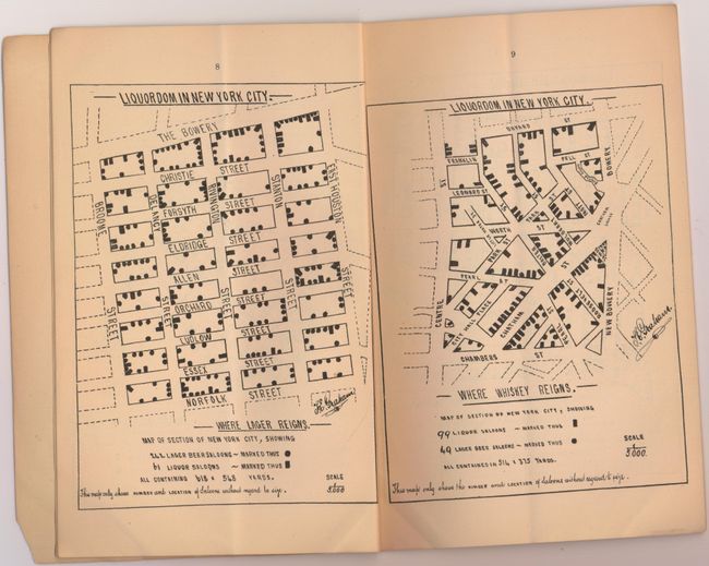 This is an unusual and fascinating piece produced by the Church Temperance Society, founded by the Episcopal Church of the United States. Unlike other temperance societies, this organization accepted members who used light amounts of alcohol. Its personal guidance was "Temperance obligatory - Total abstinence discretionary." The report includes 26 pp. of text that describe the type and number of establishments serving alcohol, meeting notes, and four single page maps showing "Where Whiskey Reigns." Included with the report is a larger folding map of Manhattan by Henry Blair (base map is Colton) identifying in red over 9,000 locations with liquor licenses. Quite a remarkable feat!