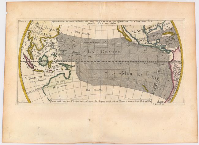 These rather early thematic maps depict the wind currents across the world's major shipping routes, showing the world on an unusual oval projection. Both maps are centered on the equator and depict the currents by means of engraved directional lines. The trade winds are shown with little arrows, augmented with the names of months. The first map displays the winds across the Atlantic and Indian Oceans. The second map focuses on the Pacific and shows a portion of North America with the island of California and partial coastlines for Australia. This pair of matched maps was engraved by Cosmant. Most of the maps in Prevost's work are by Jacques Nicolas Bellin, but these maps do not contain any attribution.