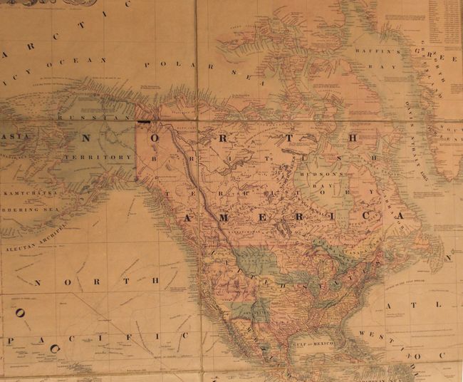 Issued folding with original color, pleasant toning throughout, one small chip just east of Alaska, and an 8" crack in Russia from Nova Zembla to Siberia. There are minor chips and pinholes in the corners of the sheet away from the map image, and most of the green silk edging is missing. There are a few occasional damp stains or small spots, but still a very attractive example for a map of this size.
