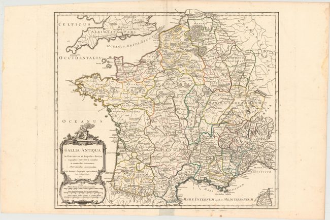 This finely engraved map illustrates ancient Gaul. It incorporates most of France with Belgium, Luxembourg, Switzerland and northwestern Italy. It shows the various tribes, towns, and ancient divisions of the region. It is embellished with a striking title cartouche that incorporates three distance scales. It was published in 1757 as part of the first edition.