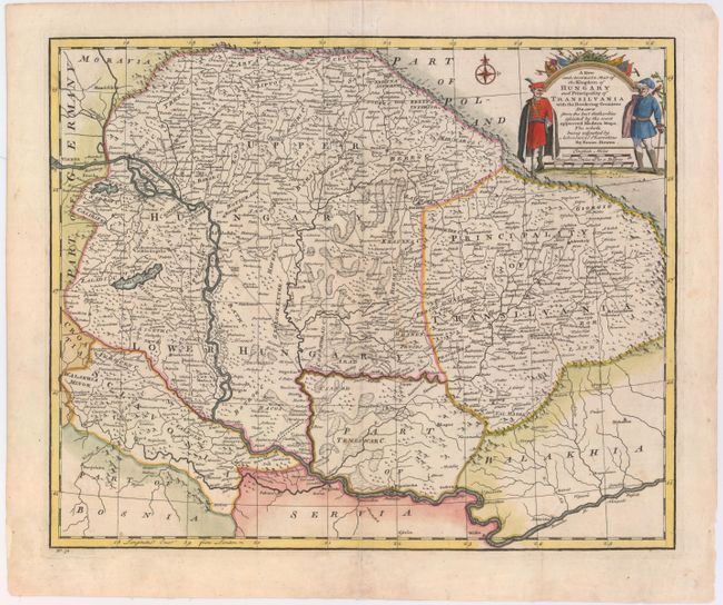 This finely engraved map of Hungary extends to Belgrade and part of Romania. The map is filled with detail and notations and shows an extensive systems of roads. The Banat of Temeswar in the southern portion of Hungary, was established by the Treaty of Passarowitz in 1718, in which the Ottoman Empire ceded the region to the Habsburg Monarchy of Austria. The southern part of the Banat of Temeswar was again ceded back to the Ottomans in the Treaty of Belgrade in 1739. The decorative title cartouche features two military officers, flags and weaponry. "No. 32" engraved below neatline at left.