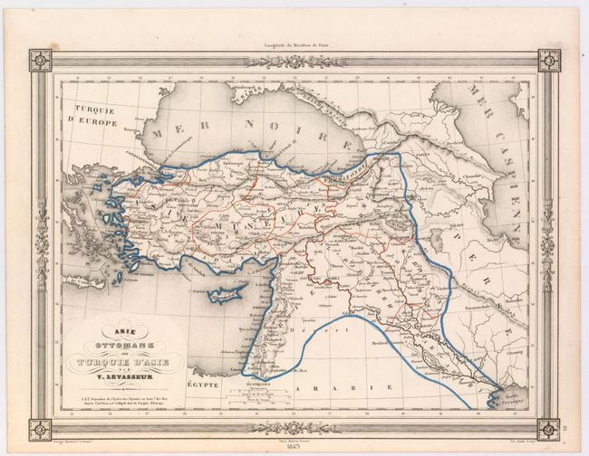 This small, crisply engraved map of the Ottoman Empire covers present-day Turkey, Syria, Lebanon, Jordan, Israel and Iraq. Political delineations are drawn and cities, towns, rivers, and topography are noted. Surrounded by a picture frame style border.