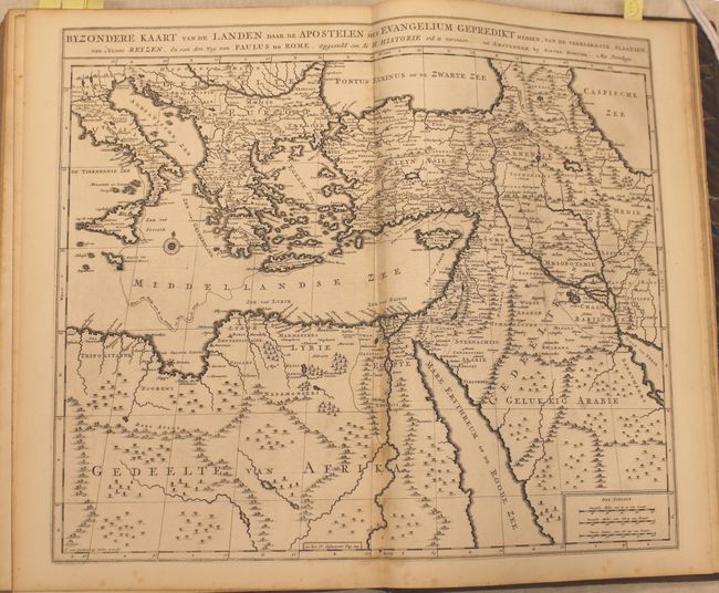 Byzondere Kaart van de Landen Daar de Apostelen Het Evangelium Gepredikt Hebben.... This expansive engraved map of the eastern Mediterranean and the Middle East features the tract of St. Paul from Jerusalem to Rome. The map is filled with mountains, forests, and oases, and is decorated with a compass rose.