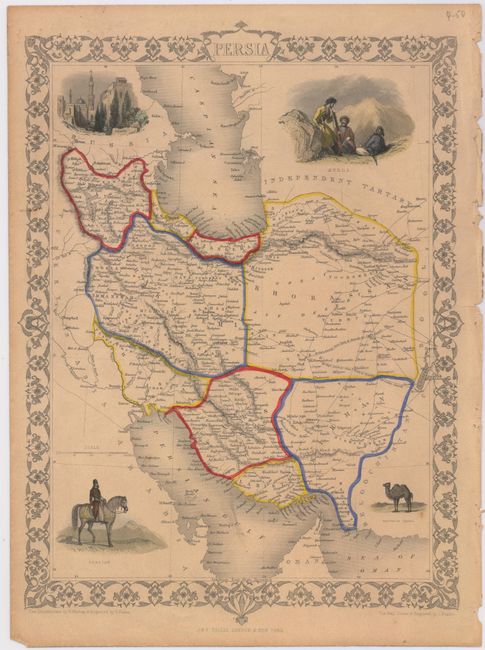 B. Persia, by John Tallis, from Illustrated Atlas (9.8 x 13.8"). Tallis' map of Persia depicts modern-day Iran, filled with towns, roads, and topographical details. Surrounding the map are vignettes of the city of Isfahan, a group of Kurds, a Persian on a horse, and a camel. The map was drawn and engraved by John Rapkin and the vignettes were drawn by H. Warren and engraved by S. Fisher. Condition: Light, overall toning and a short tear that just enters map border at right that has been closed on verso with archival tape. (B+)