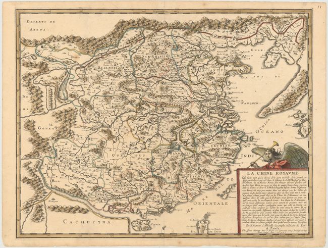 This important and attractive French map of China is based on an indigenous Chinese map copied by Jesuit Matteo Ricci, and brought back to Rome in 1590 by his fellow Jesuit, Michele Ruggieri. The map extends to include the northern tip of the Philippines and a curiously curved Korean peninsula. Korea was usually shown as an island in the 17th century, so Sanson's depiction is a cartographic improvement. The Great Wall forms the northern boundary and the map is filled with rivers, mountains and villages. A detailed explanation panel in bottom right is surmounted by Pheme, the personification of fame and renown. Engraved by Jean Somer.