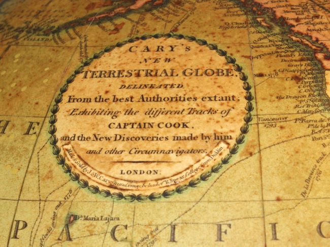 A circular title cartouche reads "Cary's/New/Terrestrial Globe/Delineated/From the best Authorities extant;/Exhibiting the Tracks of/Captain Cook,/and the New Discoveries made by him/ and other Circumnavigators./London." The distributor's imprint, R. Spear of Dublin, replaces that of Cary at the bottom of the cartouche. John Cary and his brother, William, were regarded as the finest English globe makers of the late Georgian period.