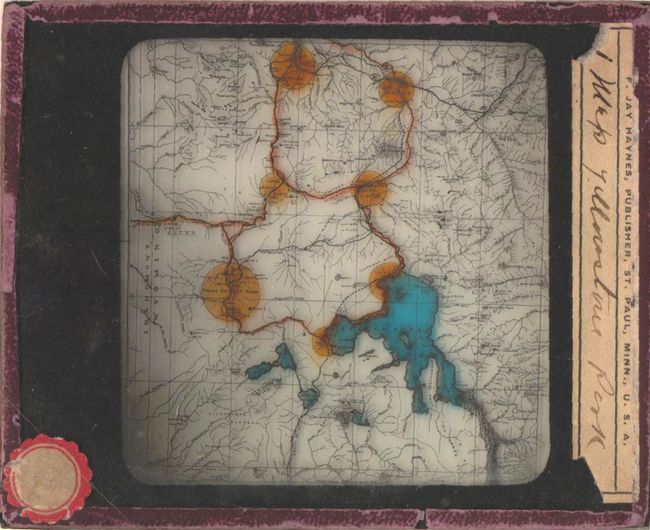 This specific slide was published by Frank Jay Haynes, who was the official photographer for both Yellowstone National Park and the Northern Pacific Railway. The tiny map shows lakes, rivers, numerous mountain peaks and highlights in orange Mammoth Hot Springs, Norris Geyser Basin and the Firehole Geysor Region to name a few. A very unique cartographic find.