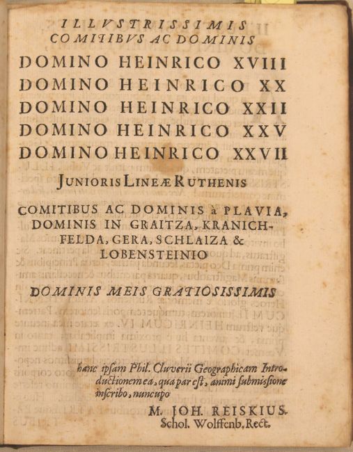 Cluver’s Introductio is considered the standard for 17th century geographical text books, as he is the father of modern historical geography. This edition of Cluver's geography was published in 1694 by the heirs of Johann Buno in Wolfenbuttel, Germany. There are 37 copper-plate engravings including the world map, maps of the continents (America, Africa, Asia, and Europe), and many regional European maps. A few of the European maps have outline color.
