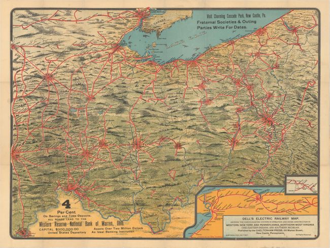 This rare and colorful pocket map of the Midwest focuses on the rapidly expanding electric railway system of the early 1900s. The map covers the region from Erie and Pittsburgh west to Detroit, South Bend and Louisville and shows both existing and proposed railway lines. An inset shows the network in western New York from Syracuse to Niagara Falls. At bottom is an advertisement for the Western Reserve National Bank of Warren, Ohio indicating this was a promotional giveaway. Folds into blue paper wrappers (3.3 x 6.6").