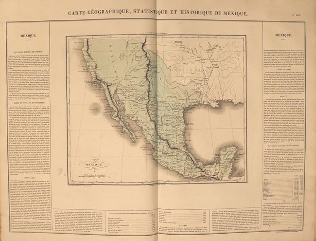 Carte Geographique, Statistique et Historique de l'Amerique Septentrionale (14.3 x 14.0"). The United States extends to the Pacific Ocean and reaches far north into Canada showing the boundary that becomes the Fifty-Four Forty or Fight dispute between England and the U.S. Alaska is Amerique Russe with good detail and place names along the coastal region, but a fully blank interior. Many Indian regions are noted throughout. In Texas (unnamed) only a few places are named; S. Antonio, Rancho, Matagorda, and San Saba. A bizarre mountain range diagonally crosses the Great Basin from Utah and nearly reaches the coast in the direction of San Clemente. The R. del Carmelo ou St. Phelipe, originating in L. Teguanyo ou Salo, freely runs through the Great Basin to its mouth at Monterrey.