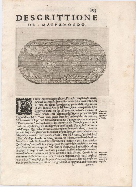 Charming miniature map of the world on an oval projection, engraved by Girolamo Porro after a larger world map by Camoccio on the Gastaldi prototype. The huge mythical Terra Incognita dominates the Southern Hemisphere. On a full sheet (8.3 x 11.6") of Italian text with decorative capital letter below map and page 193 above. Italian text continues on the verso.