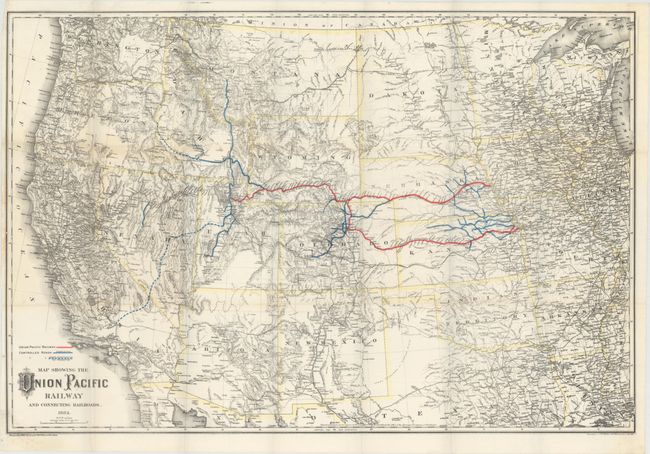 This uncommon map demonstrates the expanding Union Pacific Railway in the western United States. Completed main lines from Omaha and Kansas City through Ogden are colored in red, while ancillary "controlled" roads are shown in blue, and under construction/proposed roads are shown with dotted blue lines. The map is a testament to Colton's attention to detail and accuracy in that it includes scores of obscure little mining towns while leaving unknown areas blank, such as south-central Utah. Designed by Colton, printed by Rufus Adams and published in the 1883 stockholders report.