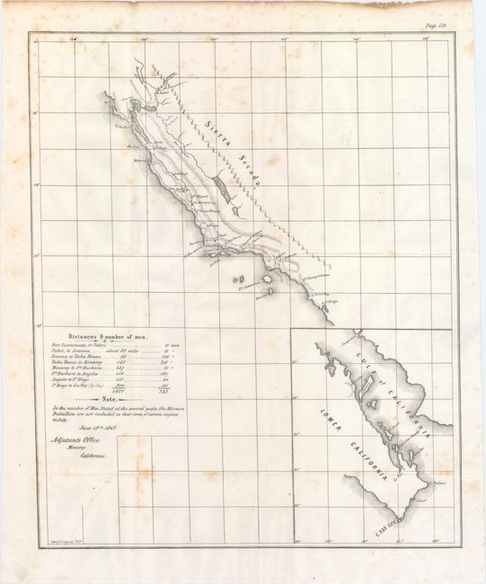 This untitled Mexican-American War map shows the southern California coast. It names San Diego, Capistrano, San Gabriel, Angeles, Monterey, and Santa Clara. A road extends from San Diego north to the San Francisco peninsula then to Sonoma and ends at Sutter's Mill (Suters) where gold would be discovered the following year. A table gives the distance between major posts and the number of soldiers posted at each. The troops of the Mormon Battalion are not included "as their term of service expires in July." The map is dated June 19, 1847 and is signed in the plate, "Adjutant's Office, Monterey, California." Large inset details the Baja from C. San Lucas up to Loreto, locating La Paz and shows Guaymas on the mainland. An uncommon issue printed by the P.S. Duval company of Philadelphia.