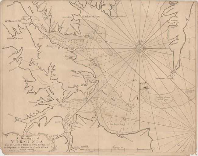 This plan covers the southern Chesapeake Bay, James River, and York River, and is regarded as the first published regional map of Virginia. As Virginia's population expanded dramatically during the early 18th century, settlers began moving further up the rivers in the Tidewater region in order to find good land. This growth created a need for more detailed and larger-scale maps of the region. This map was created by Mark Tiddeman, who conducted hydrographic surveys of the area as master of the Royal Navy ship Tartar from 1725-28. Tiddeman's logbook survives in the British National Archives and includes notes about the Tartar stopping and inspecting ships encountered along the coast, suggesting that his mission in the area may also have included compliance checks to enforce British customs laws. Tiddeman's chart is filled with extensive detail of soundings, creeks, inlets, and shoals, including Middle Ground shoal, which is noted as "Almost Dry." The cities of Williamsburg, Gloucester, York, and Norfolk are pictorially depicted. Just below the eastern panhandle is the notation "Here the Tartar lost her Anchor Octobr. 17th 1726," referring to Tiddeman's vessel.
