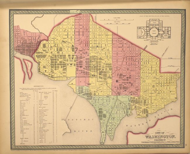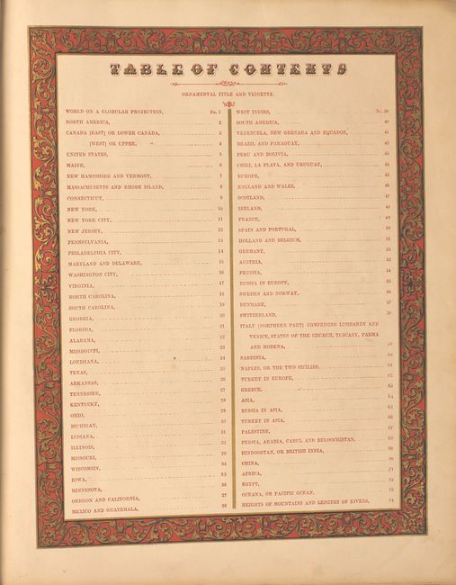 Folio. Hardbound, frontis, pictorial title page, table of contents, 74 hand-colored maps. Bound in original marbled paper with red leather tips and spine, and a red leather title label on front cover. This edition was published by Thomas, Cowperthwait & Co. who had purchased the copyright from Samuel Augustus Mitchell in 1850.