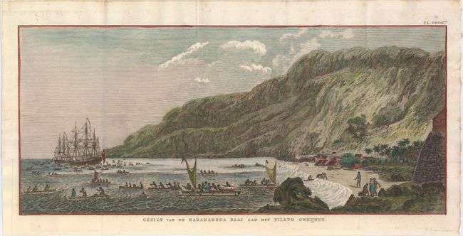 This uncommon engraving depicts one of the earliest views of Hawaii from Cook's third and final voyage. Cook explored Hawaii before heading north to explore the Pacific coast, where they tracked past the Bering Strait before being turned back by ice. The expedition then sailed south to Hawaii, where Cook was killed in a dispute with the natives at Kealakekua Bay on February 14th, 1779. Clerke, his second-in-command, took over the expedition and they surveyed further in Hawaii before returning north to continue the exploration for the Northwest Passage. This engraving is a spectacular view of the bay where Cook met his end, showing his ships (Resolution and Discovery) and the boats of the native Hawaiians as well as their village. Based on a drawing by John Webber, and published in a Dutch edition of Cook's A Voyage to the Pacific Ocean…