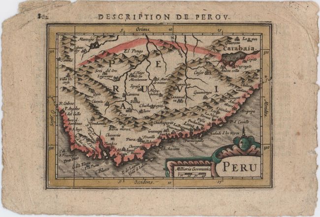 This charming miniature map depicts Peru and Ecuador, identifying numerous cities, including Lima, Cusco, and Quito. The map is oriented with north to the left, and the equator runs vertically at left. Decorated with a strapwork cartouche that incorporates the distance scale. The majority of the maps for Bertius' geographical treatise were engraved by Jodocus Hondius Jr. after Mercator. French text on verso.