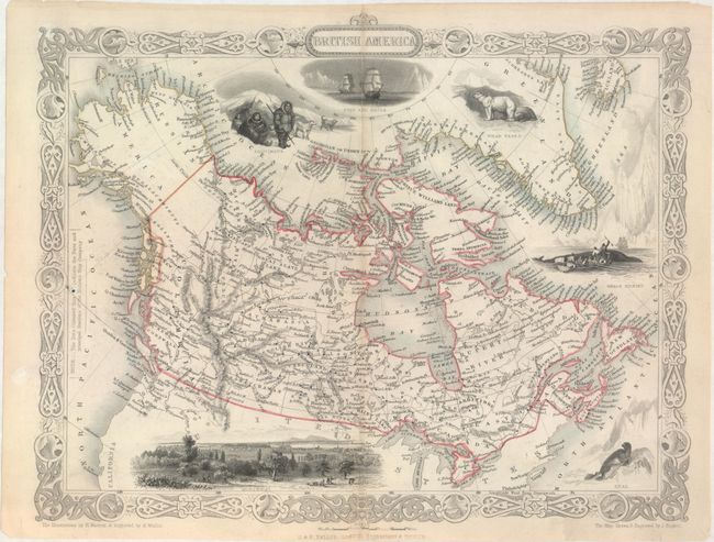 This decorative map is surrounded in a delicately engraved border and further embellished with six vignettes. The area mapped extends to show all of today's Canada and Alaska, here called Russian America. In Canada, at least 23 districts are outlined. Dots indicate the numerous forts and principal stations of the Hudson's Bay Company. This edition includes a bird's-eye view of Montreal, a seal, whale fishing, Eskimo (here called Esquimaux), polar bears, and a nautical scene showing the ships Fury and Hecla, which made expeditions to the Arctic in search of the Northwest Passage under William Edward Parry. The illustrations are by H. Warren and engraved by Robert Wallis; the map is drawn and engraved by J. Rapkin.
