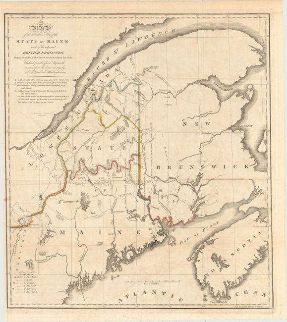 The first map details the boundary dispute between the United States and Great Britain relating to Maine. Hand coloring is used to show the boundary as claimed by the United States and by Great Britain, with a third line labeled "that of the Arbiter" which closely corresponds to Maine's present-day border with Canada. A table gives the major points of contention in this border dispute. Another table names land grants belonging to six land holders. The second map (13.3 x 13") is in black and white and was included in the same Senate report for historical purposes. It was extracted from Mitchell's map of 1755 by W.J. Stone.