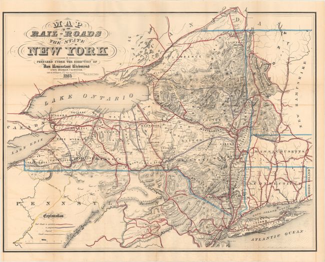 A. Map of the Rail-Roads of the State of New York Prepared Under Direction of Van Reusselaer Richmond State Engineer and Surveyor, by George R. Perkins, dated 1858, hand color (29.1 x 22.5"). Detailed map shows existing, in progress, and proposed railroads along with canals in New York and adjoining states. Delineated by county, the map shows topography, the river system, and numerous place names. Condition: Issued folding with light offsetting and a few tiny splits at fold intersections.