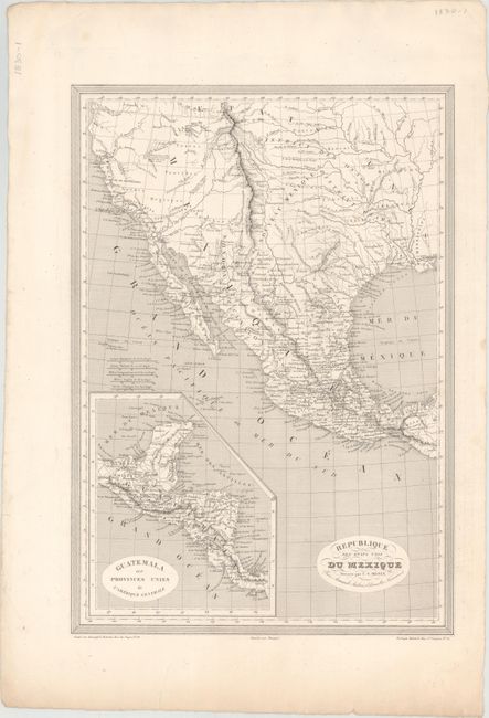 This map depicts Mexico extending north to the 42nd parallel and east to the Sabine River as established by the Adams-Onis Treaty of 1819. The name Texas does not appear on the map with only a few place names identified in the region including San Antonio, San Felipe and Nacogdoches. Arkansas, Missouri, Kansas, Louisiana and Mississippi are noted but not delineated on the map. The western topography is represented in hachure and is based on the expeditions of Lewis and Clark, Pike and Long. Includes an inset of Central America at bottom left. Engraved by Grenier.