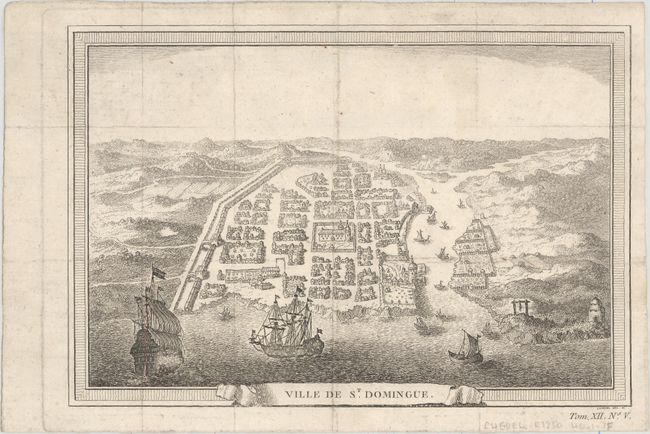 B. Ville de St. Domingue. This birds-eye view of Santo Domingo shows sailing ships and sailboats in the harbor and the city stretched out to the horizon. The fortified city is protected by the sea and the Isabelle River with a complex of walls, towers, and a wide moat. The central plaza features the cathedral, and some poor soul has been hung in the gallows on the southeast shore.