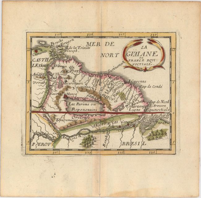 This charming miniature map covers the northwestern region of South America. The map is centered on the mythical Lac Parime ou Roponouuini with the golden city of Manoa el Dorado on its northern shore. Pierre Duval was Nicolas Sanson's nephew and pupil. He published a wide range of atlases and individual maps including a fine miniature world geography with many of the maps based on Sanson.