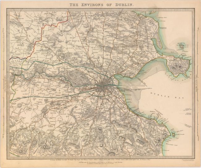 Nice matched pair of maps. The former is a terrific plan showing the city and river in very good detail and features facades of the fourteen most important buildings of the city. The latter includes a good plan of the city and covers the countryside around Dublin, extending out about six miles to include the Hill of Howth and Killiney Bay. Both published by Baldwin & Cradock.