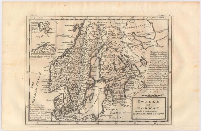 A. Sweden and Norway Agreeable to Modern History, by Herman Moll, published 1744 (10.3 x 7.7"). Copper engraved map of Sweden and Norway showing towns, topographical features, and even a few roads. An inset at the top left details the North Cape of Norway. Notations describing the size of the region and the city of Stockholm appear on either side of the map.