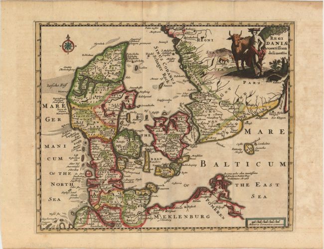 This charming small map shows the historical regions in Denmark and the tip of Sweden. The map is fully engraved with rivers, forests and ancient cities and is embellished with a compass rose and a decorative title cartouche featuring Mercury and several bulls in a pasture.