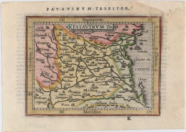 This miniature map covers the region surrounding Padua and is embellished with a strapwork title cartouche. Venice is shown at right. The map was engraved by the brothers Ambrose and Ferdinand Arsenius who had been assistants to Frans Hogenburg and co-engravers of Ortelius' folio Theatrum. The maps were copied from Philip Galle's 1598 edition of the Epitome and were considered superior to Galle's maps. This series of maps was accompanied by text by Michel Coignet and was published in Antwerp by Jan van Keerbergen. Latin text on verso.