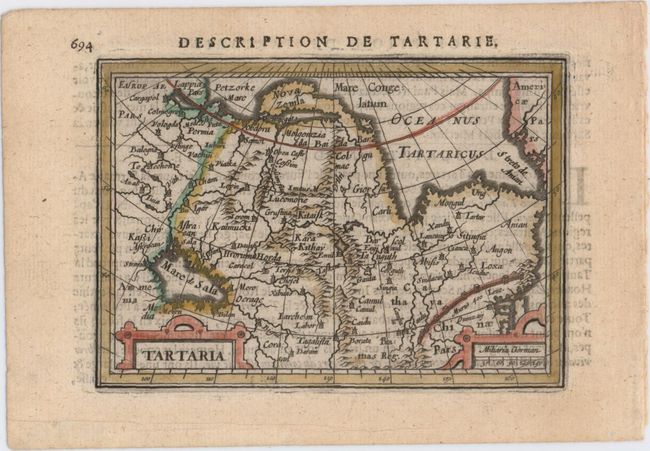 This charming miniature map covers the northern part of Asia from the Black Sea to the Strait of Anian and the tip of Americae Pars. Numerous towns, rivers and mountain ranges are shown, and the Great Wall of China is also depicted. The majority of the maps for Bertius' geographical treatise were engraved by Jodocus Hondius Jr. after Mercator. French text on verso.